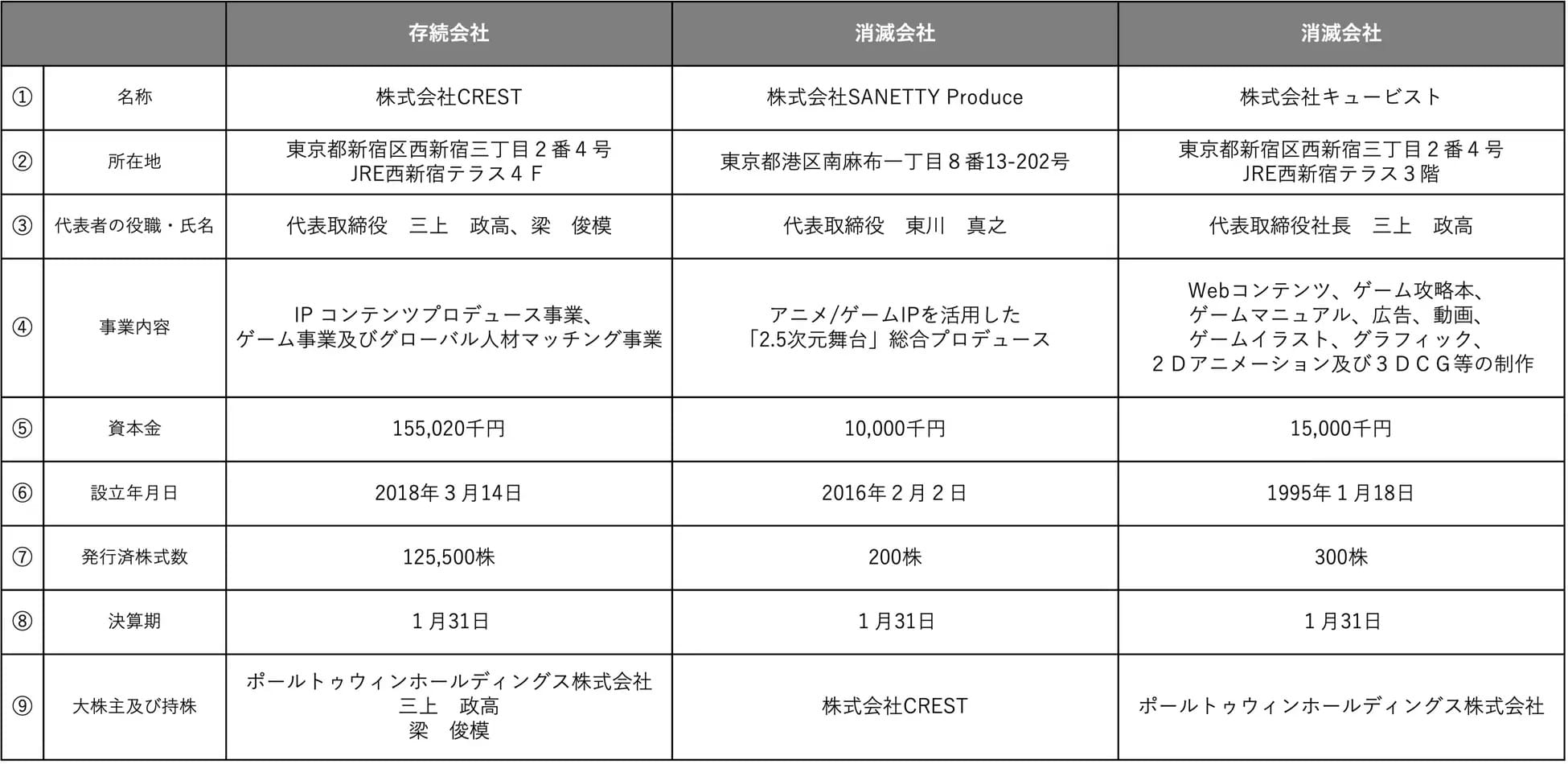 本合併では、CRESTが得意とするコンテンツプロデュースやIPライセンス運用、キュービストが得意とするグラフィック制作、マーケティング・プロモーションを統合することで相乗効果を産み出し、経営の観点では人材、ファシリティ、ナレッジの共有による経営の効率化を進め、これまで以上にメディア・コンテンツ事業の成長を加速させることが可能であると判断し、本合併を決定いたしました。また、CRESTが注力事業と位置付けているステージ事業についても、スピード感をもって事業拡大に臨むためSANETTYを合併することも併せて決定いたしました。